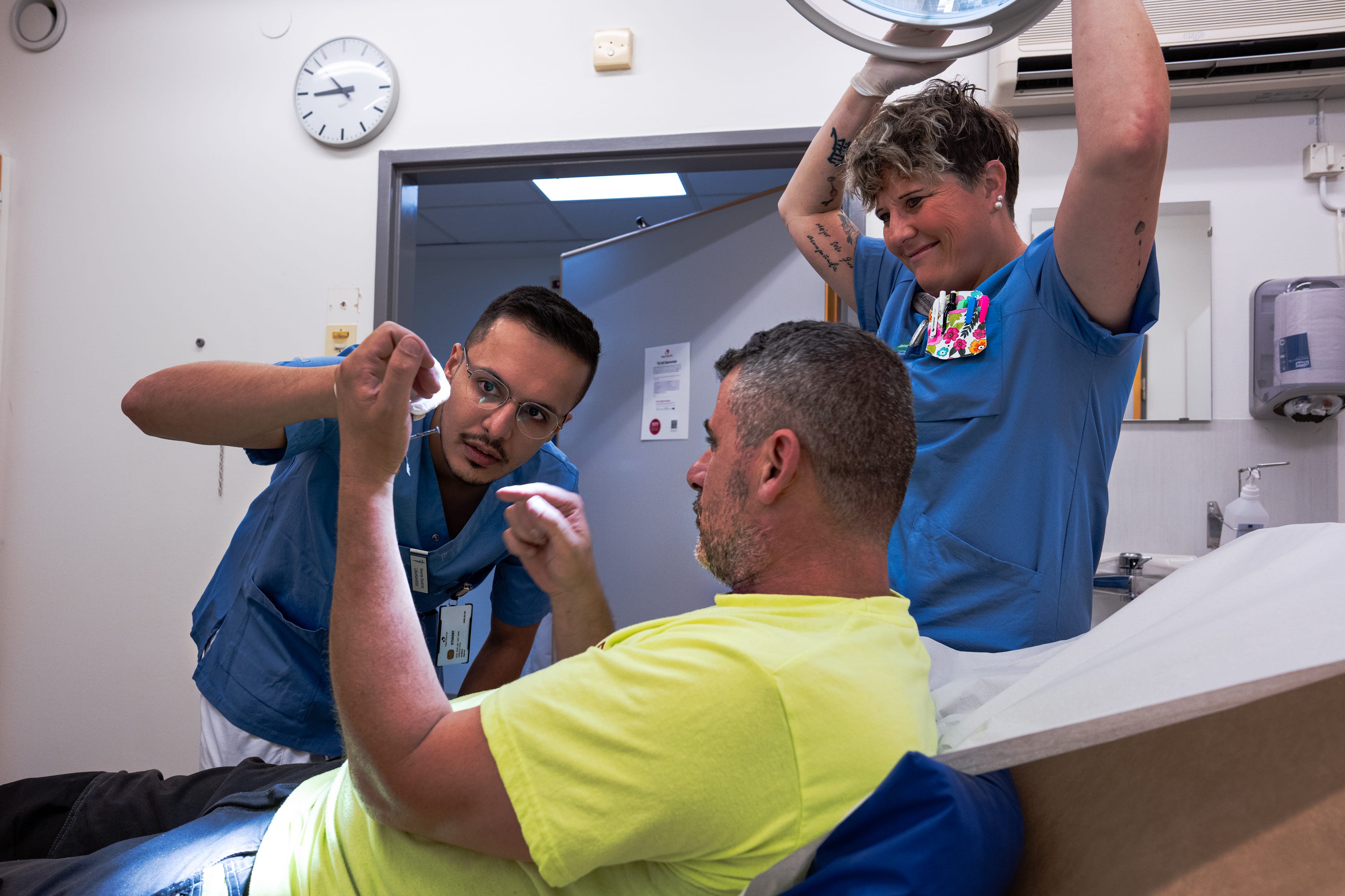 We arrive at the examination room and his patient, a construction worker with a nail through his hand, is waiting. Nawras opens the door, introduces himself and within seconds the two of them are joking, the construction worker laughing at how sideways his Monday morning has gone, Nawras peppering in questions as he pulls on latex gloves and lays him down. He cuts away the work glove, presses gently along the fingers, checking for nerve damage. Before the man has even finished a story about his foreman Nawras is sitting him back up. He’ll need to go to the regional hospital, there’s some numbness and he wants it examined closer before the nail is taken out. He calls a nurse, gives the man’s shoulder a squeeze and walks out. There are other patients to see.